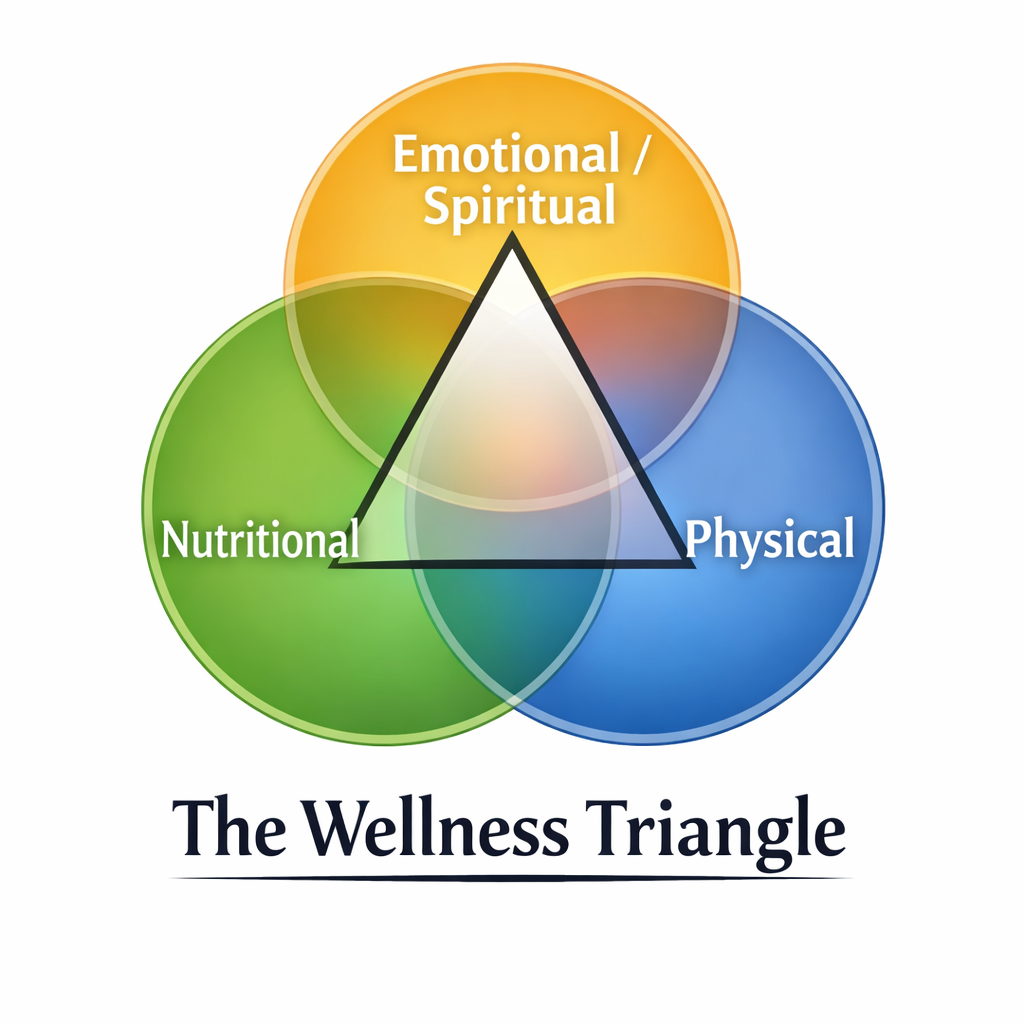 The Wellness Triangle integrates physical strength, intentional nutrition, and emotional/spiritual clarity into one unified framework for sustainable growth.